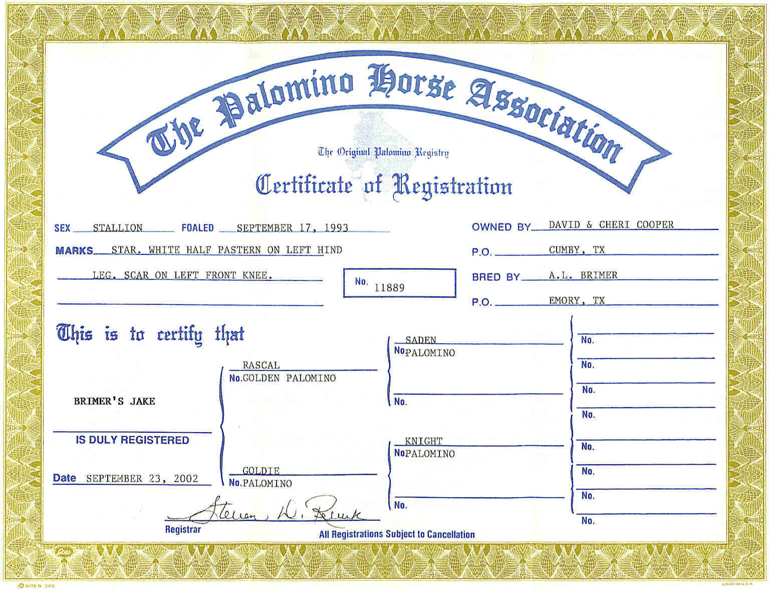 He is registered with the Palomino Horse Association. Although Jake has never been shown himself, he comes