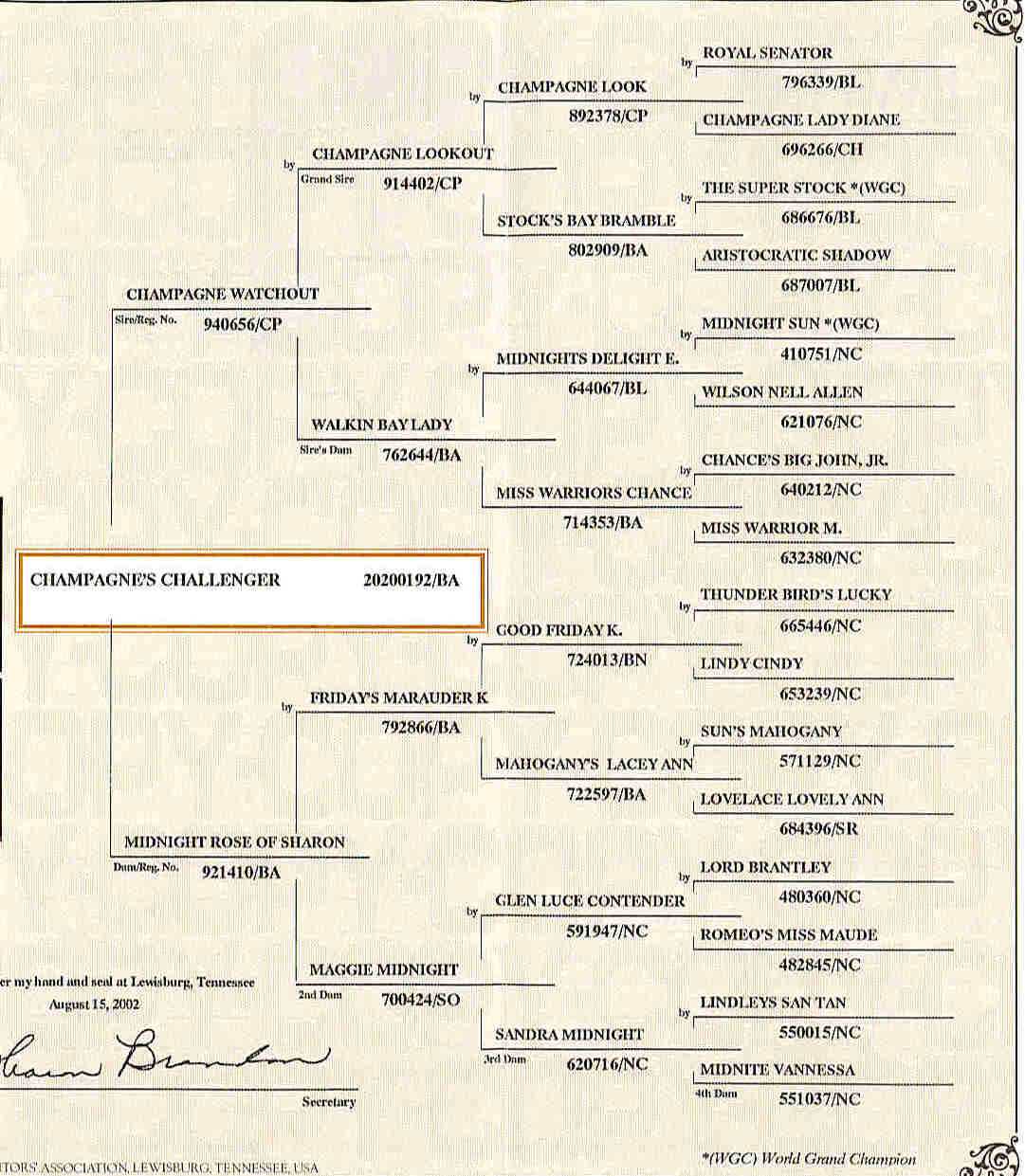 Midnight Rose of Sharon. Challengner's pedigree includes World Grand